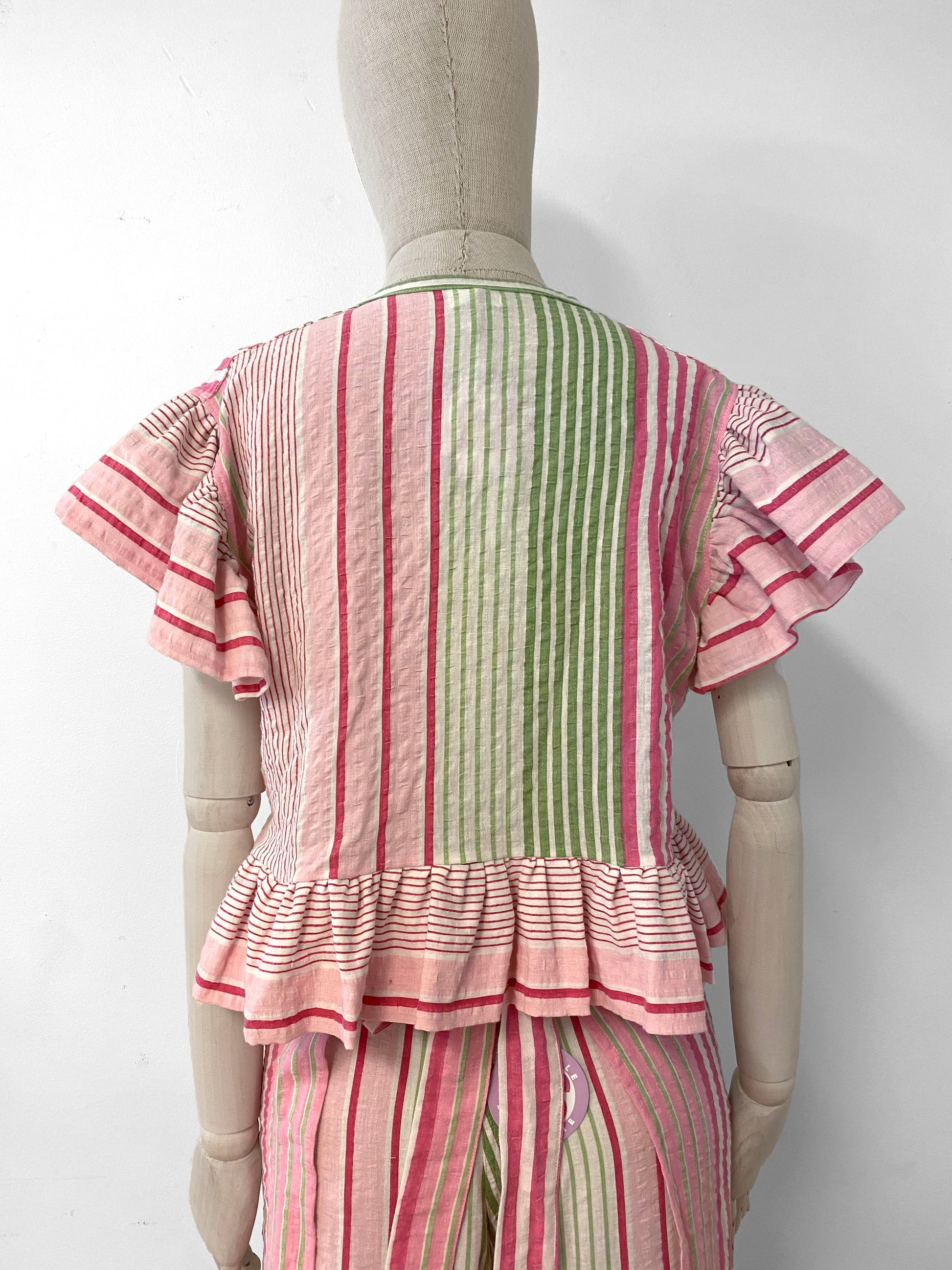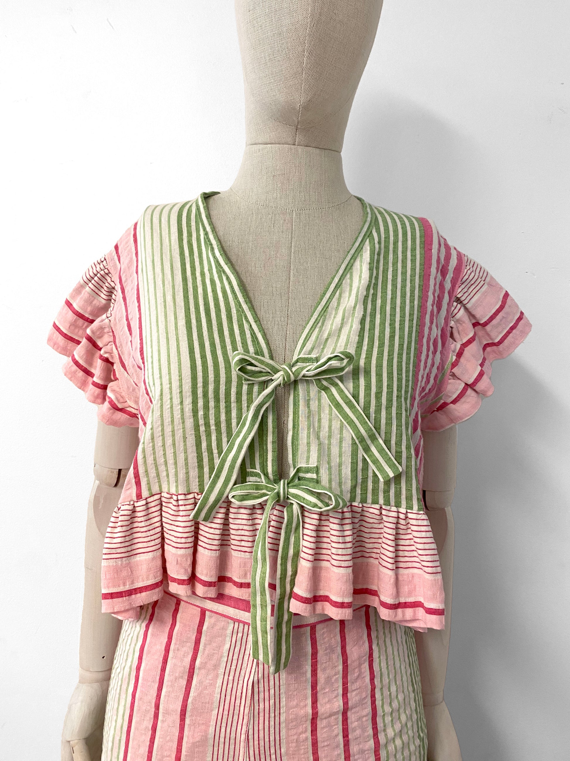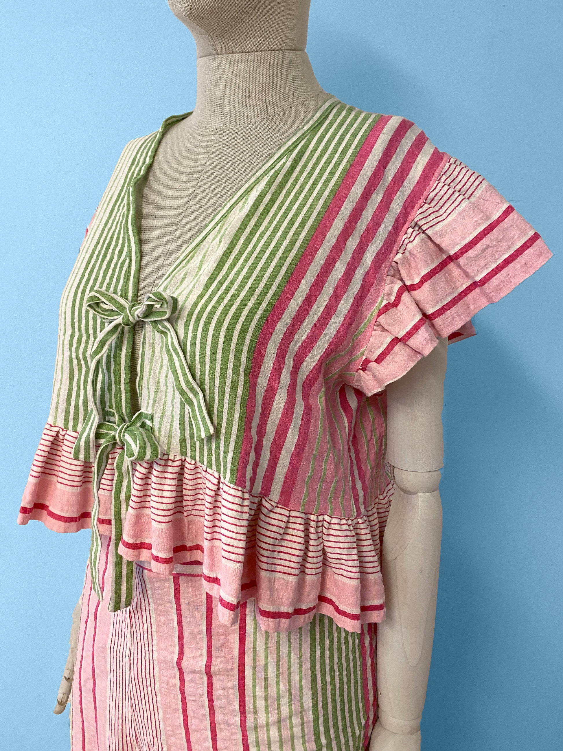 Pink and green top with ruffles. Ties at front.